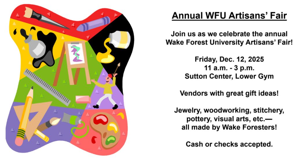 Inclement weather can’t keep us from again showcasing the numerous talents of Wake Foresters with our annual Artisans’ Fair! The event, which was delayed from last week, will now occur on Friday, Dec. 12 in the Sutton Center/Wellbeing Center lower gym from 11 a.m.-3 p.m., prior to the Winter Celebration hosted by the President’s Office, which will be in the upper gymnasium from 2-4 p.m.
