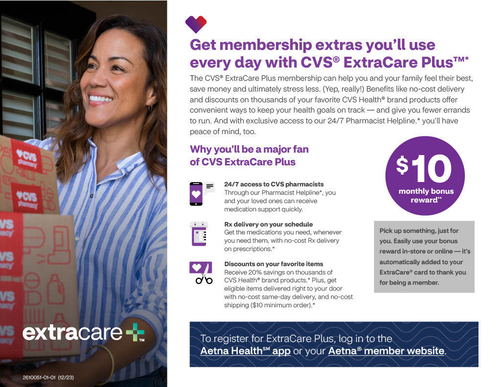 The CVS® ExtraCare Plus membership can help you and your family feel their best, save money and ultimately stress less. (Yep, really!) Benefits like no-cost delivery and discounts on thousands of your favorite CVS Health® brand products offer Why you’ll be a major fan of CVS ExtraCare Plus convenient ways to keep your health goals on track — and give you fewer errands to run. And with exclusive access to our 24/7 Pharmacist Helpline.* you’ll have peace of mind, too.